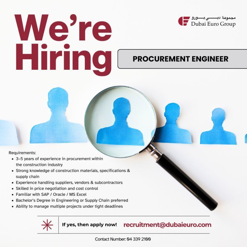 تعلن Dubai Euro Group عن حاجتها إلى مهندس مشتريات (Procurement Engineer) للعمل فورًا ضمن مشاريع إنشائية كبرى بدولة الإمارات.
