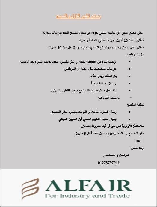 يعلن مصنع الفجر للغزل والنسيج عن حاجته إلى فني جودة نسيج (QC) للعمل فورًا بمقره في مدينة العاشر من رمضان، ضمن بيئة صناعية مستقرة وفرص حقيقية للتطور المهني.