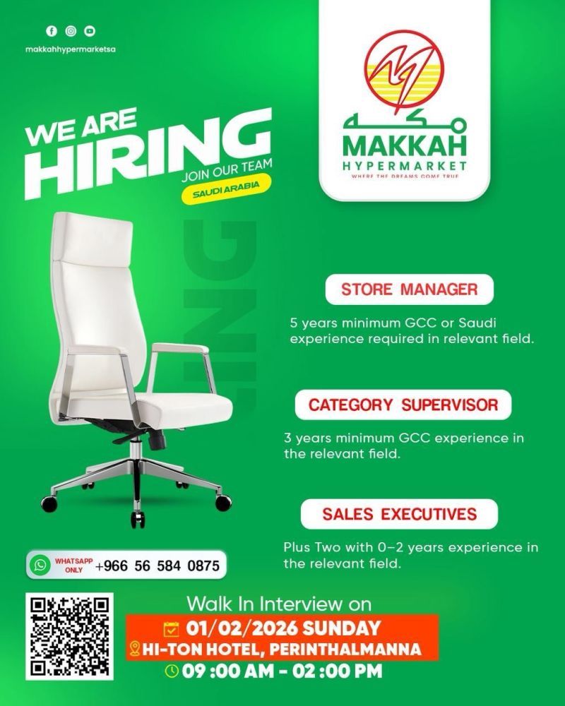 يعلن هايبر ماركت مكة عن فتح باب التوظيف لعدد من الوظائف الإدارية والبيعية، مع مقابلات شخصية مباشرة (Walk-in Interview) داخل المملكة العربية السعودية.