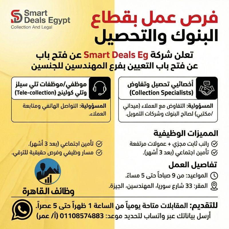تعلن شركة Smart Deals Egypt عن فتح باب التعيين فورًا للعمل في مجال التحصيل البنكي والتفاوض مع العملاء داخل فروعها بمنطقة المهندسين.