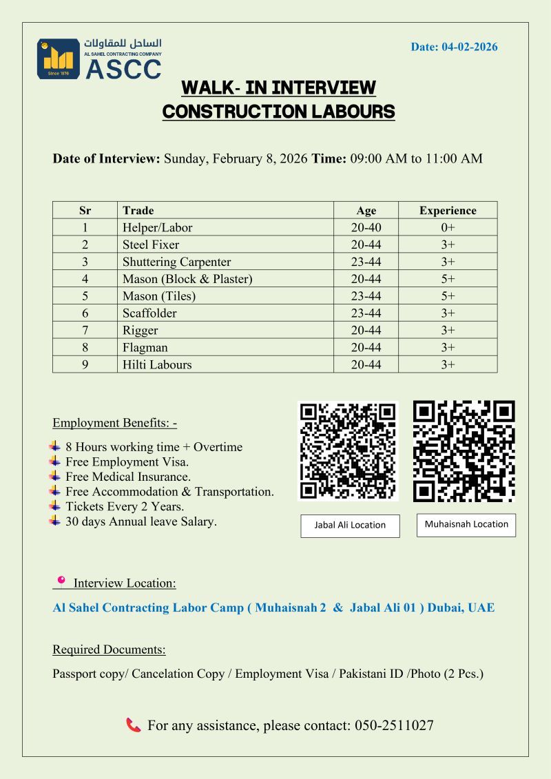 تعلن شركة السهل للمقاولات (ASCC) عن فتح باب التوظيف الفوري لعدد كبير من عمال الإنشاءات للعمل في مشاريعها داخل دبي – الإمارات مع مزايا شاملة واستقرار وظيفي.