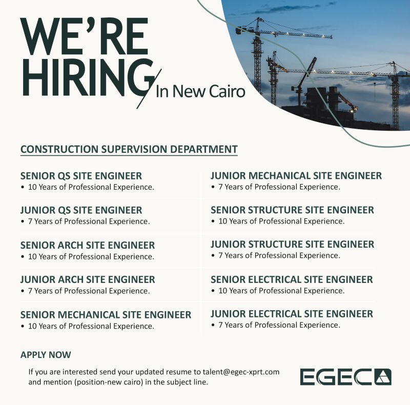 تعلن شركة EGEC عن فتح باب التوظيف الفوري لعدد من مهندسي المواقع (Senior & Junior) للعمل ضمن إدارة الإشراف على الإنشاءات بمشروعات كبرى في القاهرة الجديدة.