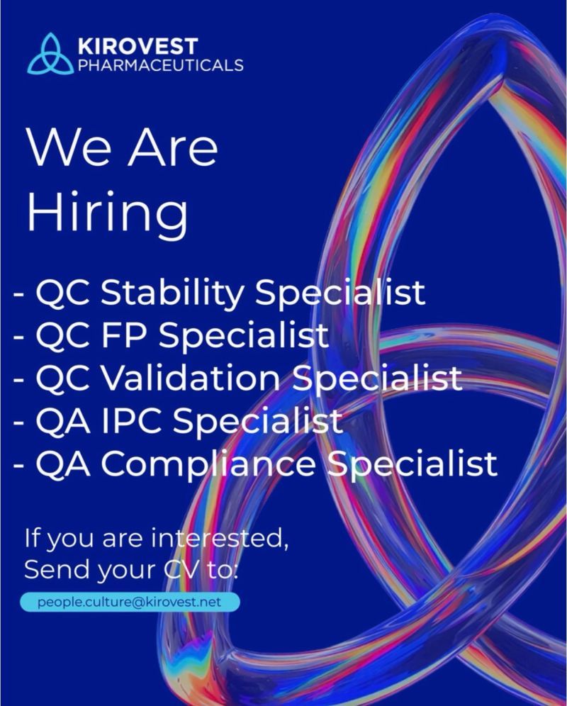 تعلن Kirovest Pharmaceuticals عن فتح باب التوظيف لعدد من وظائف الجودة (QC & QA) ضمن بيئة احترافية تلتزم بأعلى معايير GMP والجودة الدوائية.