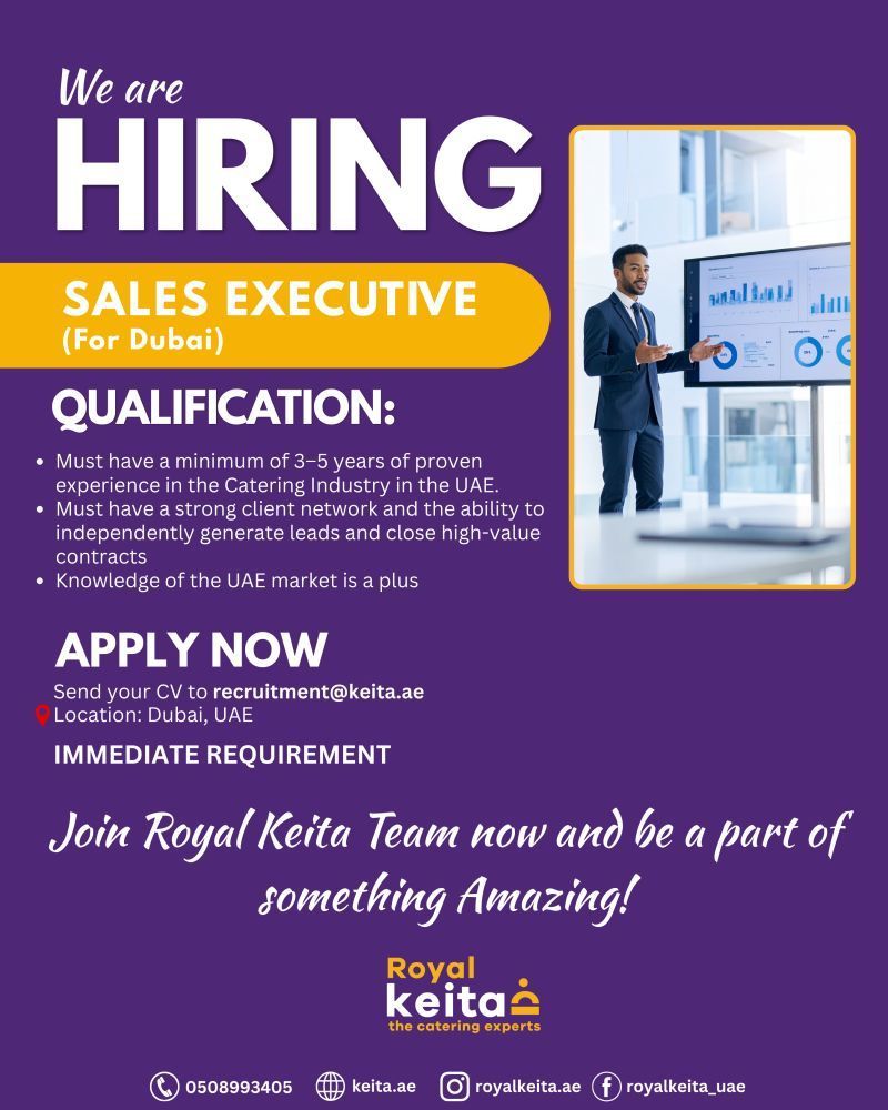 تعلن شركة Royal Keita الرائدة في خدمات الكاترينج بدولة الإمارات عن حاجتها إلى Sales Executive محترف للعمل فورًا في دبي.