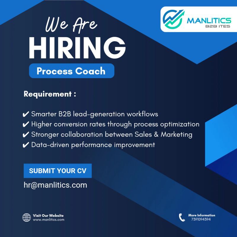 تعلن Manlitics B2B ITES عن فتح باب التوظيف لوظيفة Process Coach للانضمام إلى فريقها المتخصص في تحسين عمليات توليد العملاء في قطاع B2B وتحقيق نمو قابل للقياس.