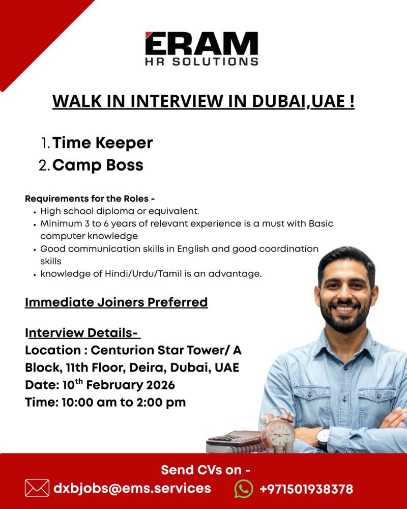 تعلن ERAM HR Solutions عن مقابلات مباشرة (Walk-in Interview) في دبي لتعيين: