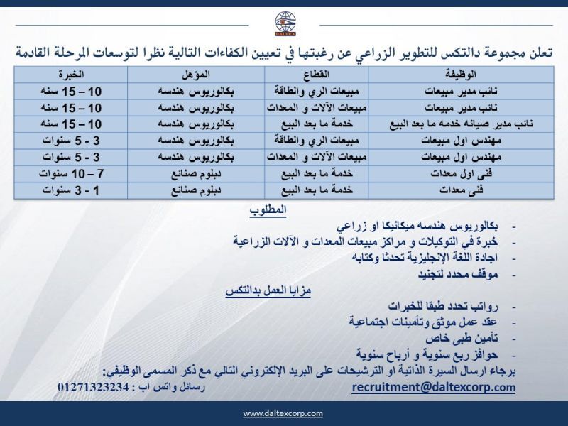 تعلن مجموعة دالتكس للتطوير الزراعي (Daltex Group) عن رغبتها في تعيين كفاءات هندسية وفنية ضمن خطتها التوسعية للمرحلة القادمة.