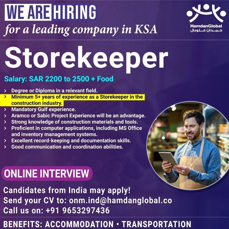 تعلن شركة رائدة في قطاع الإنشاءات عن حاجتها إلى Storekeeper محترف بخبرة قوية للعمل ضمن مشاريع كبرى في السعودية.
