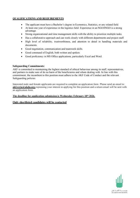 خبرة لا تقل عن سنة واحدة في العمل اللوجستي (الخبرة مع المنظمات غير الحكومية ميزة قوية).