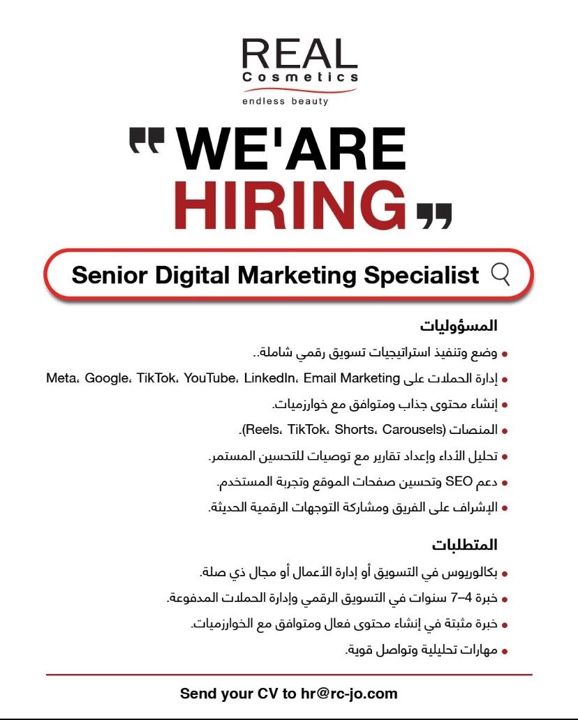 فرصة ذهبية: Senior Digital Marketing Specialist – Real Cosmetics عمّان 2026
