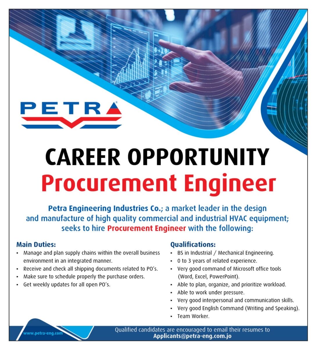 تعلن شركة بترا للصناعات الهندسية – Petra Engineering Industries Co.، الرائدة في تصميم وتصنيع أنظمة التكييف والتبريد التجارية والصناعية (HVAC)، عن حاجتها لتعيين مهندس مشتريات للعمل بدوام كامل في مدينة عمّان.
