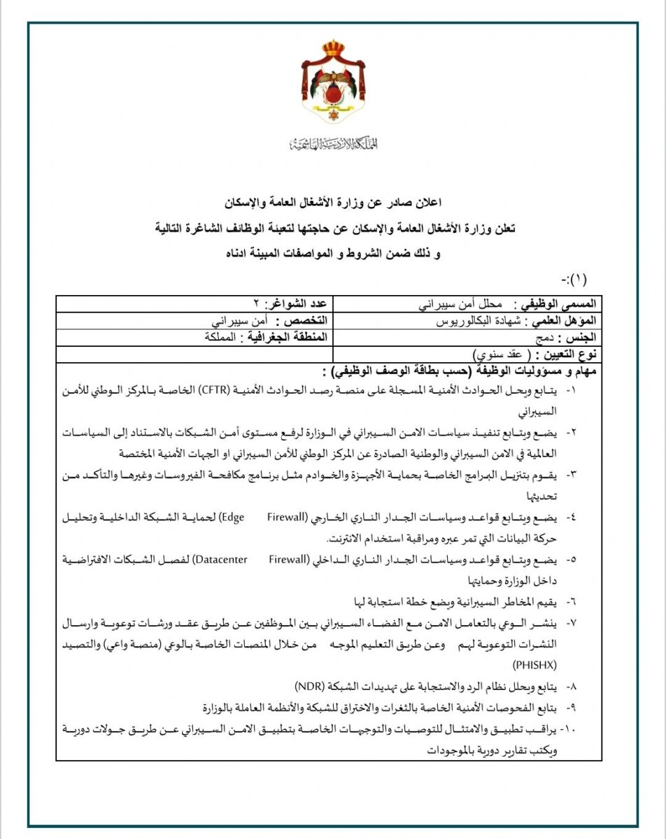 محلل أمن سيبراني – وزارة الأشغال العامة والإسكان