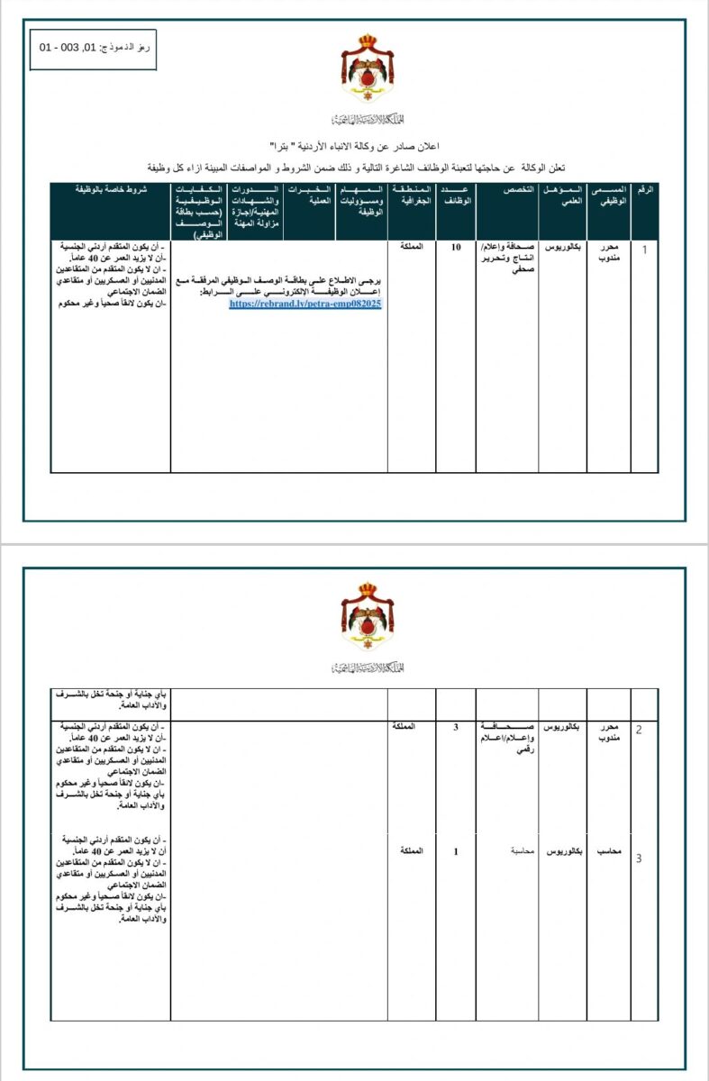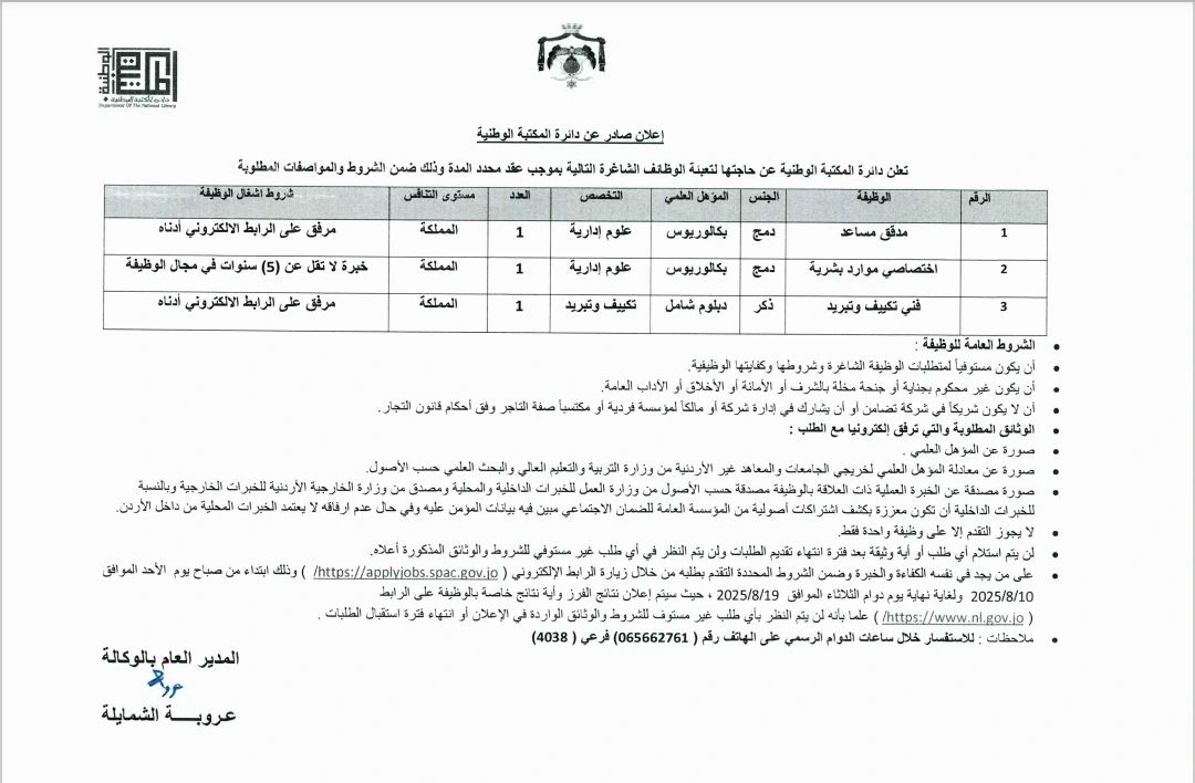 تعلن عدة جهات حكومية في الأردن عن حاجتها لتعيين عدد من الموظفين ضمن عقود محددة المدة في التخصصات التالية: