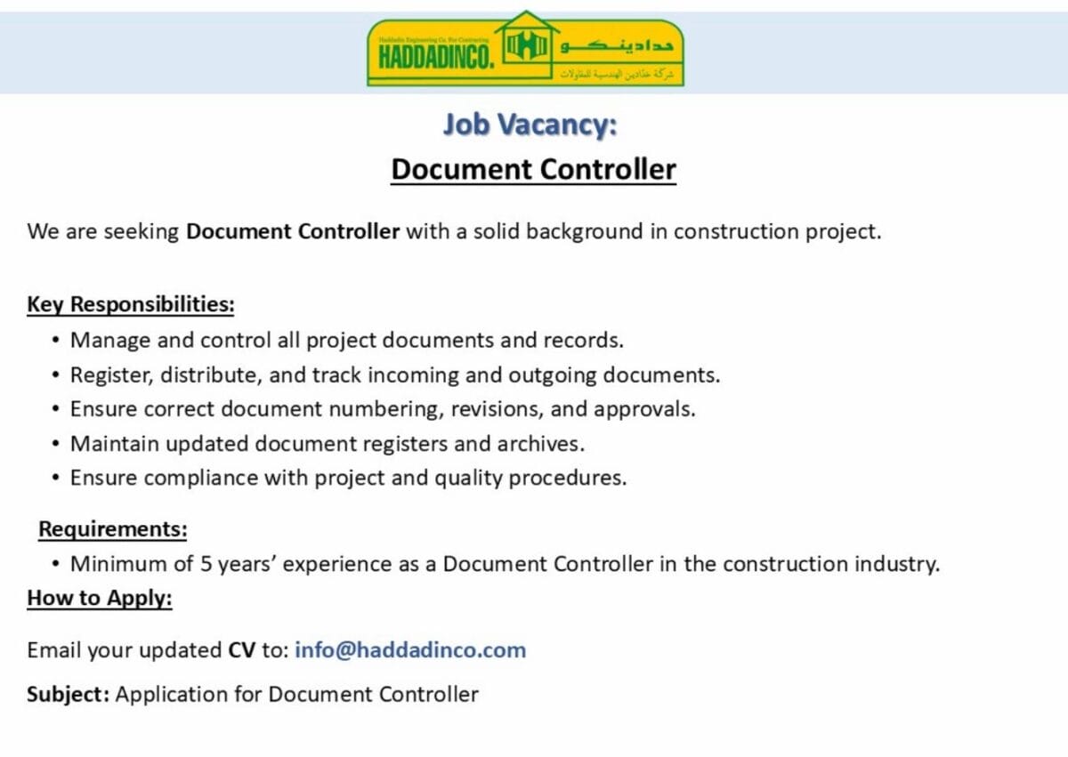 شركة Haddadinco تعلن عن حاجة فورية لتعيين Document Controller محترف يمتلك خبرة قوية في إدارة مستندات المشاريع الإنشائية ويجيد العمل باحترافية عالية ضمن بيئة منظمة وسريعة.