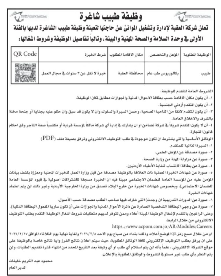 مطلوب فورا | وظيفة طبيب شاغرة | شركة العقبة لإدارة وتشغيل الموانئ | فرص عمل متميزة | فبراير 2026