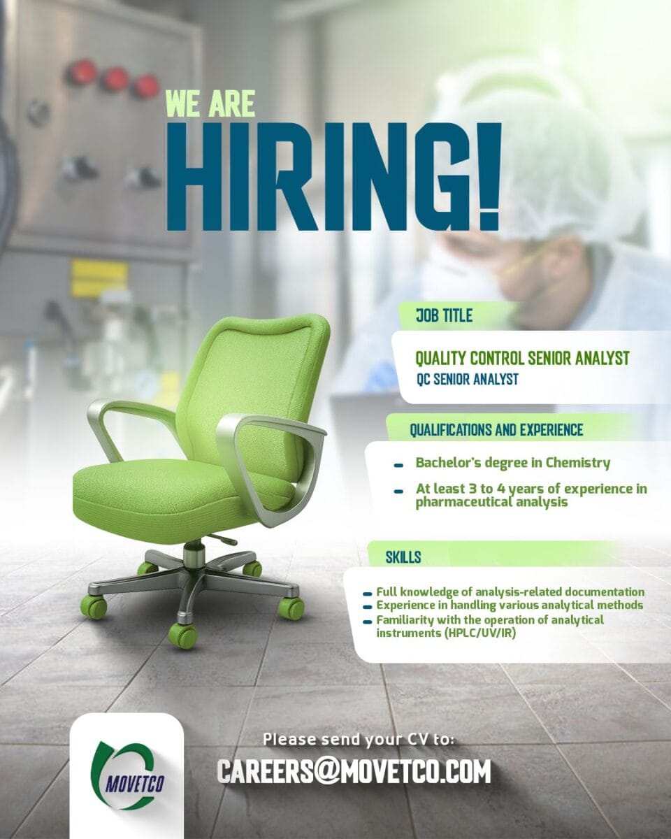 تعلن شركة MOVETCO عن حاجتها لتعيين محلل جودة أول – Senior QC Analyst للانضمام إلى فريق الجودة، والمساهمة في ضمان أعلى معايير التحليل الدوائي والدقة في النتائج.