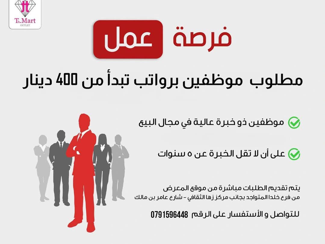 T.Mart Outlet تعلن عن حاجتها لتوظيف موظفي مبيعات فورًا برواتب تبدأ من 400 دينار أردني مع بيئة عمل احترافية وفرص استقرار وظيفي.