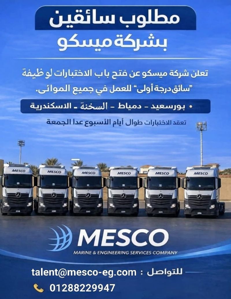 تعلن شركة MESCO – للخدمات البحرية والهندسية عن فتح باب التوظيف فورًا لوظيفة سائق درجة أولى للعمل في جميع موانئ جمهورية مصر العربية.