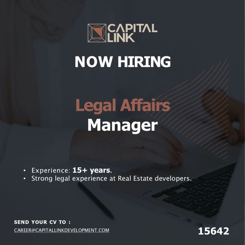 تعلن شركة Capital Link Development عن حاجتها إلى تعيين Legal Affairs Manager لقيادة الإدارة القانونية ودعم المشروعات العقارية الكبرى للشركة.