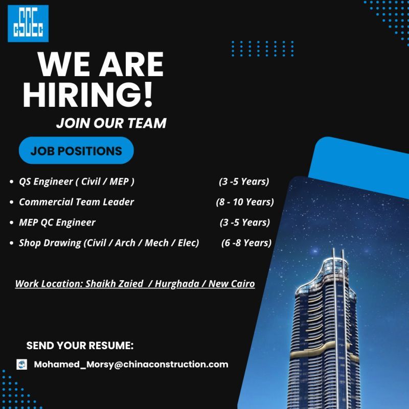 تعلن شركة CSCEC عن فتح باب التوظيف الفوري لعدد من الوظائف الهندسية والقيادية للعمل في مشروعاتها الكبرى داخل القاهرة الجديدة، الشيخ زايد، والغردقة.
