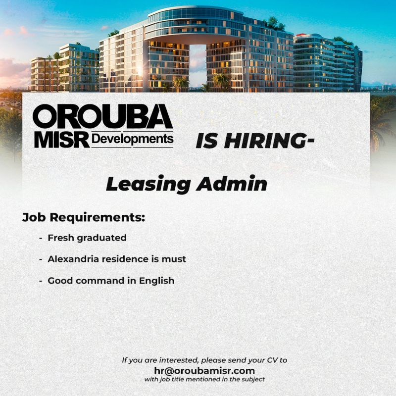 تعلن Oruba Misr Developments عن فرصة عمل مميزة لحديثي التخرج للعمل بوظيفة Leasing Admin داخل فرع الشركة بمدينة الإسكندرية.