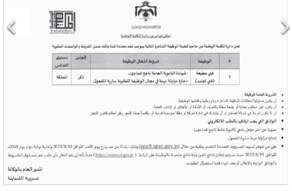 وظائف حكومية في الأردن 2025 – فني صيانة لدى المكتبة الوطنية