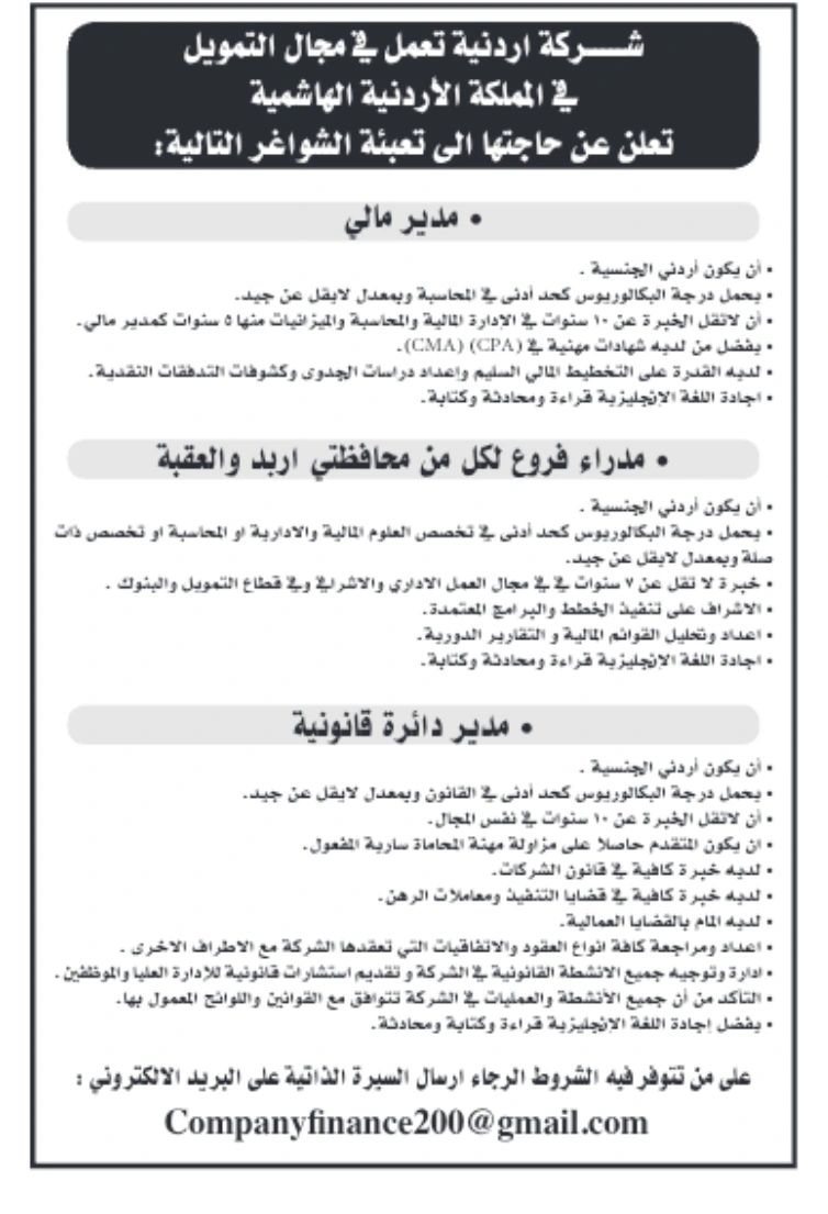 تُعلن شركة أردنية تعمل في مجال التمويل في المملكة الأردنية الهاشمية عن حاجتها لتعبئة الشواغر التالية: