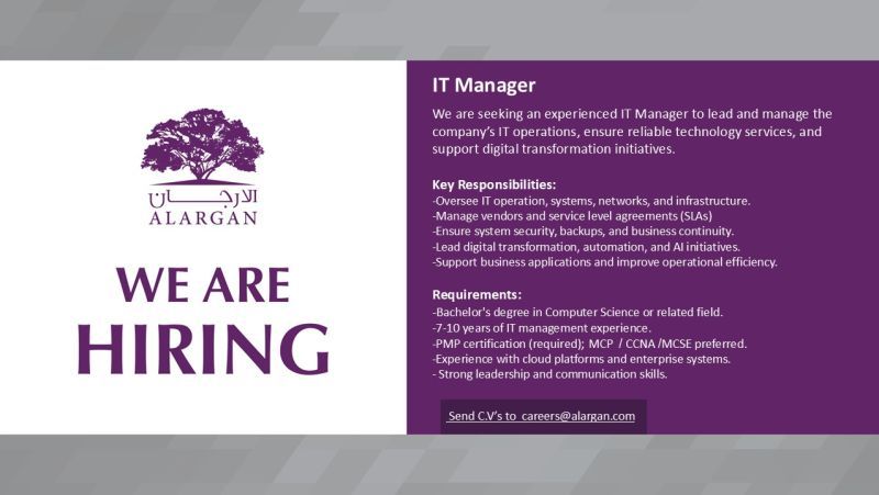 عاجل: مطلوب IT Manager في شركة العرجان – فرصة قيادية مميزة
