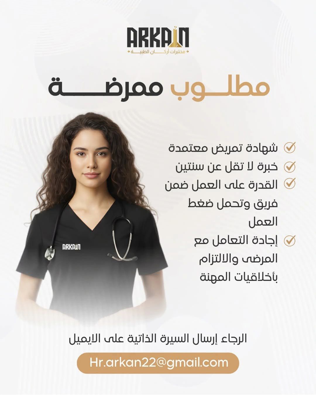 إذا كنتِ ممرضة طموحة تبحثين عن بيئة عمل احترافية وفرصة استقرار وظيفي حقيقية، فإن مختبرات أركان الطبية تفتح باب التوظيف الآن للانضمام إلى فريقها المتميز.