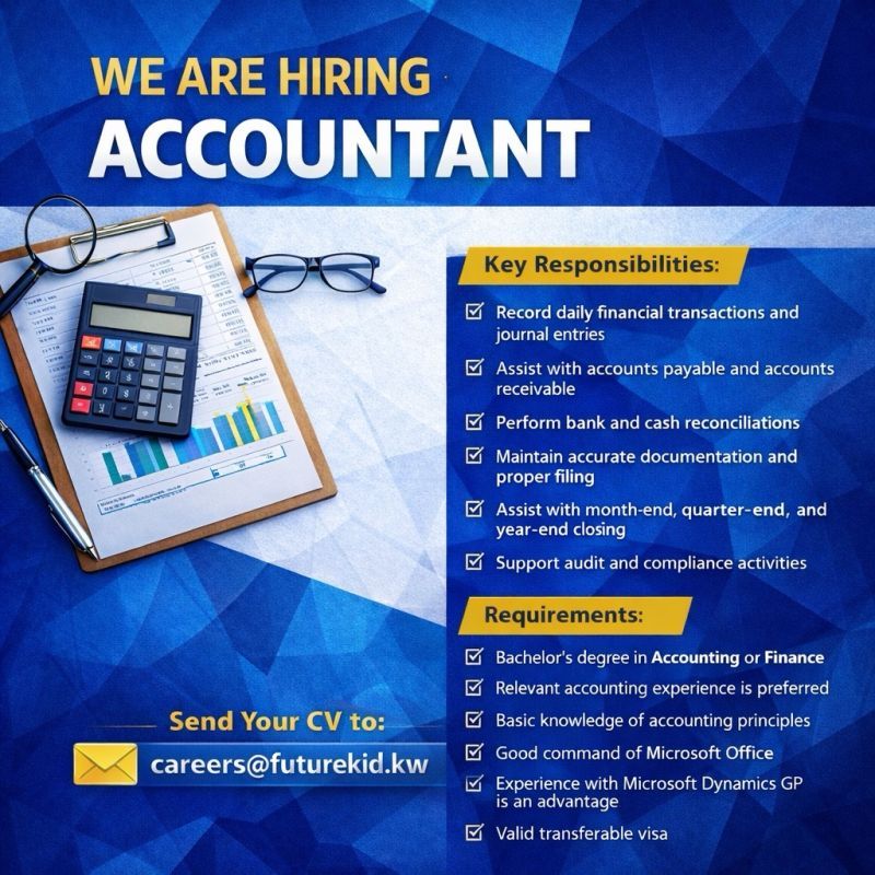 هذه فرصتك للانضمام إلى فريق مالي احترافي والعمل ضمن شركة معروفة في السوق الكويتي.