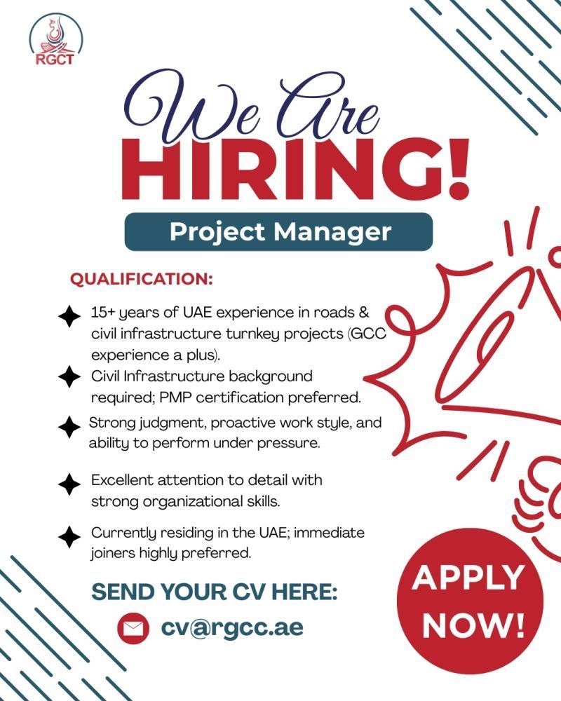 تعلن شركة RGCT عن حاجتها إلى مدير مشروع (Project Manager) بخبرة طويلة في مشاريع الطرق والأعمال المدنية بنظام تسليم المفتاح داخل دولة الإمارات، مع أفضلية لمن لديه خبرة خليجية وشهادة PMP.