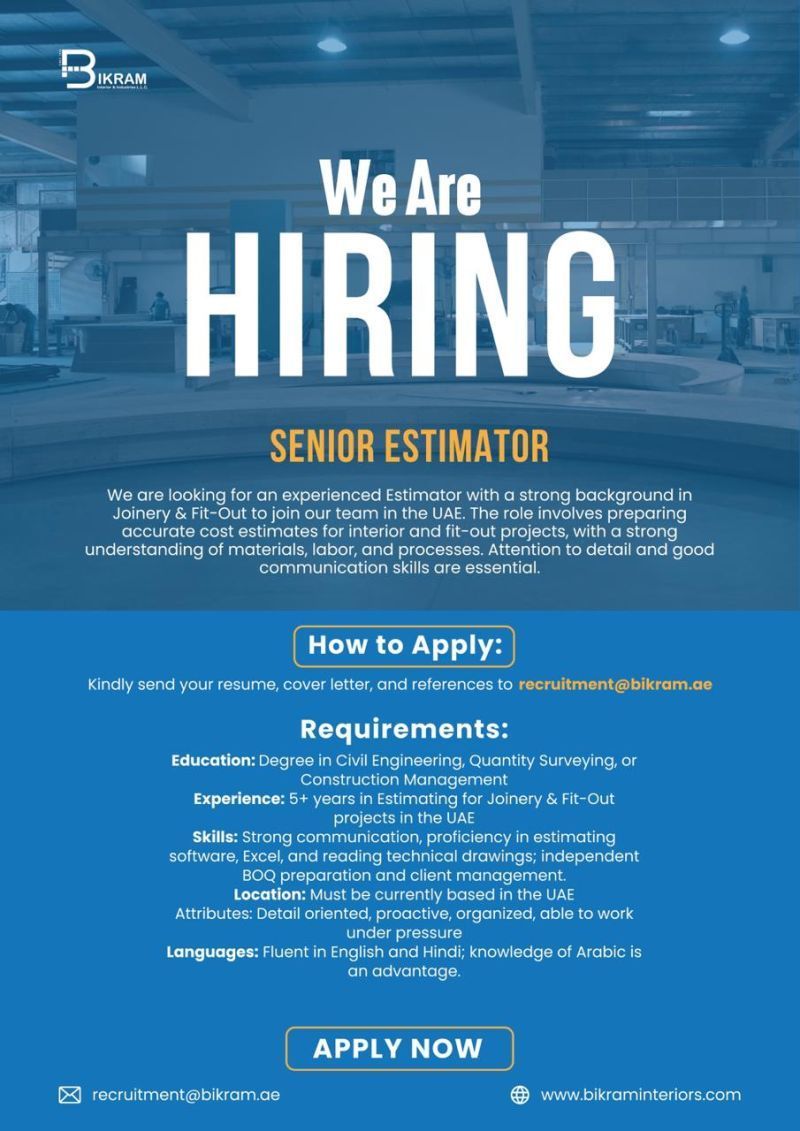 إذا كنت تمتلك خبرة قوية في تقدير التكاليف لمشاريع الـ Joinery والـ Fit-Out وتبحث عن فرصة مهنية مستقرة داخل الإمارات، فهذه فرصتك للانضمام إلى شركة متخصصة في المشاريع الداخلية الراقية.