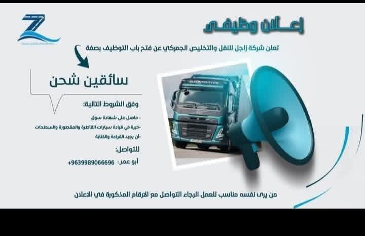 تعلن شركة زاجل للنقل والتخليص الجمركي عن حاجتها إلى سائقين شحن محترفين للعمل في بيئة ديناميكية ومهنية.