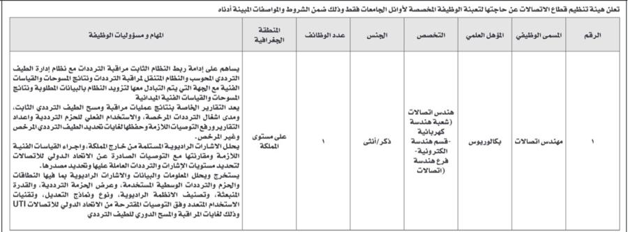 إعلان وظيفة مهندس اتصالات – هيئة تنظيم قطاع الاتصالات
