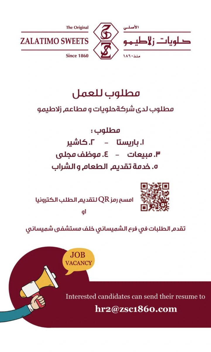 تُعلن شركة حلويات ومطاعم زلاطيمو – منذ عام 1860 – عن توفر فرص عمل في فرعها بمنطقة الشميساني، خلف مستشفى الشميساني.