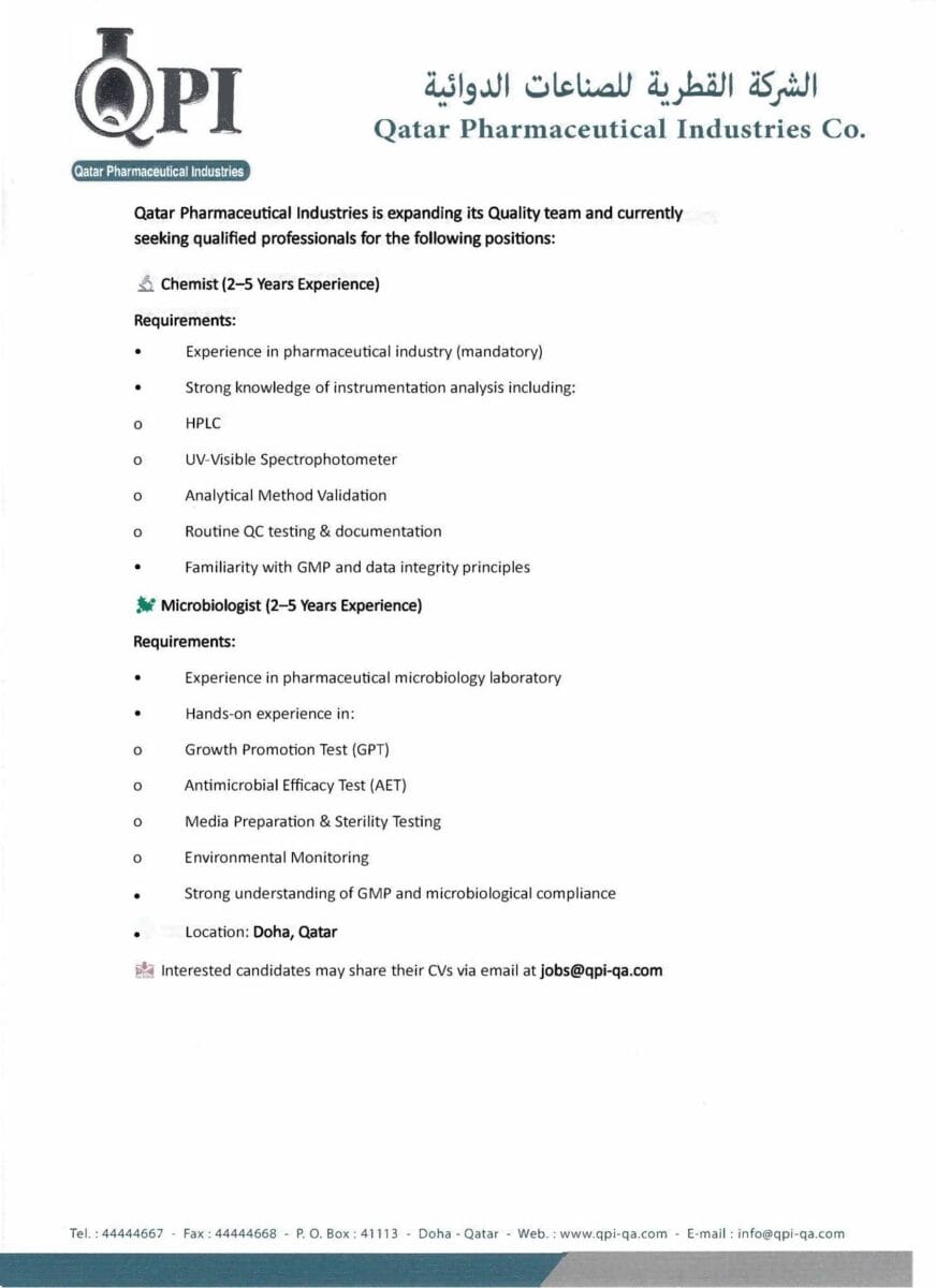 تعلن Qatar Pharmaceutical Industries (QPI) عن توسعة فريق ضبط الجودة لديها وتوظيف: