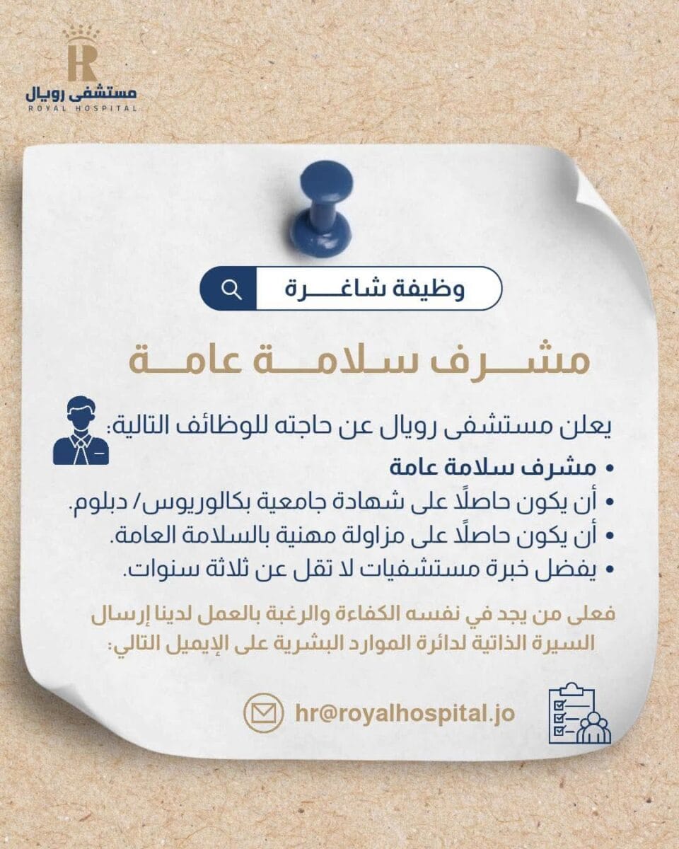 🚨 مطلوب فورًا مشرف سلامة عامة – مستشفى رويال