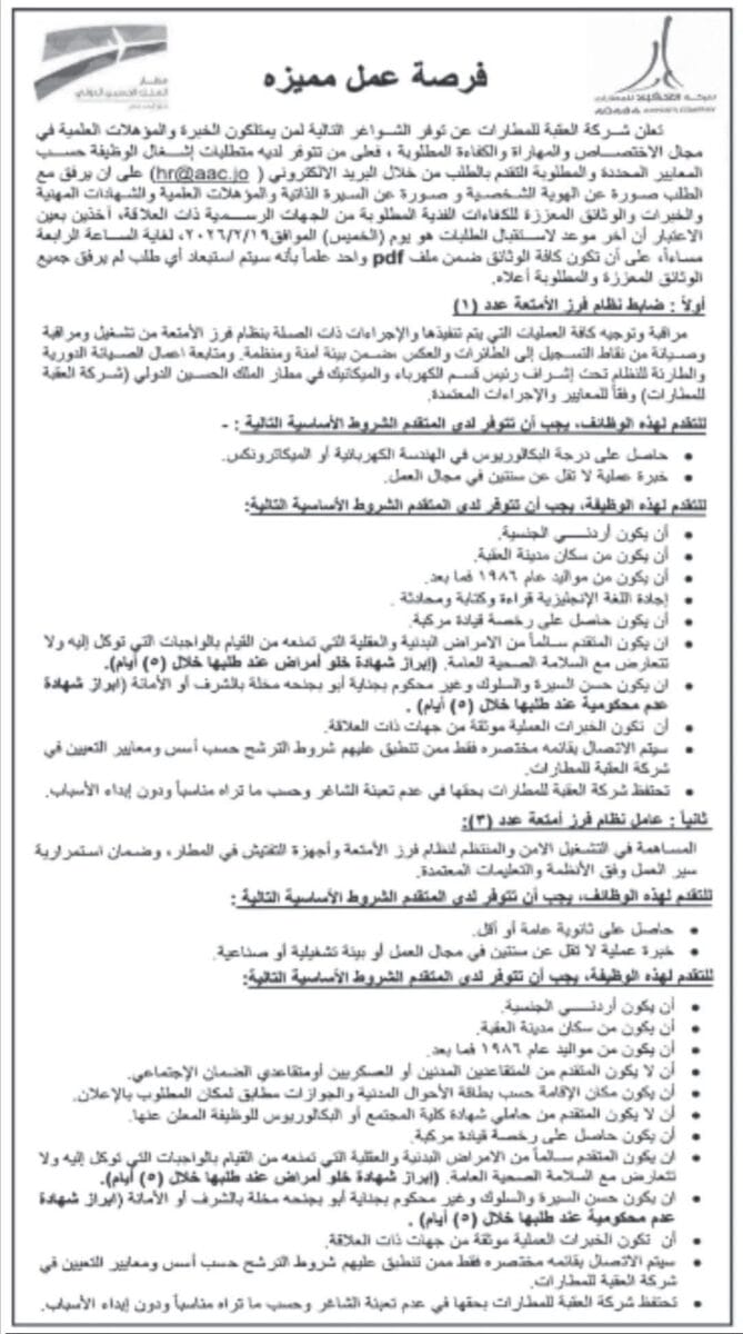 تعلن شركة العقبة للمطارات عن توفر فرص عمل مميزة للعمل في مطار الملك حسين الدولي في العقبة ضمن بيئة تشغيلية متقدمة. إذا كنت تمتلك المؤهلات الهندسية أو الخبرة التشغيلية المطلوبة، فهذه فرصتك الذهبية للانضمام إلى قطاع الطيران في الأردن.