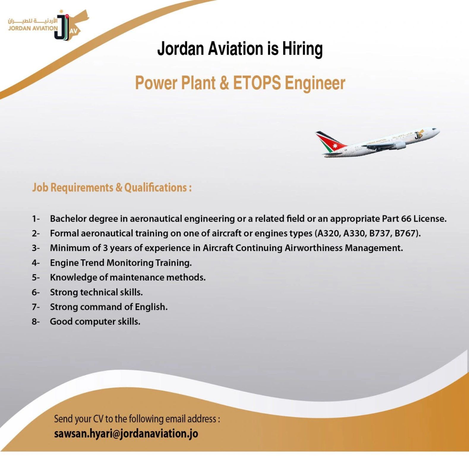 تعلن شركة Jordan Aviation عن حاجتها لتعيين كوادر هندسية متخصصة للانضمام إلى فريقها الفني ضمن بيئة احترافية متقدمة في مجال إدارة استمرارية صلاحية الطائرات (CAMO).