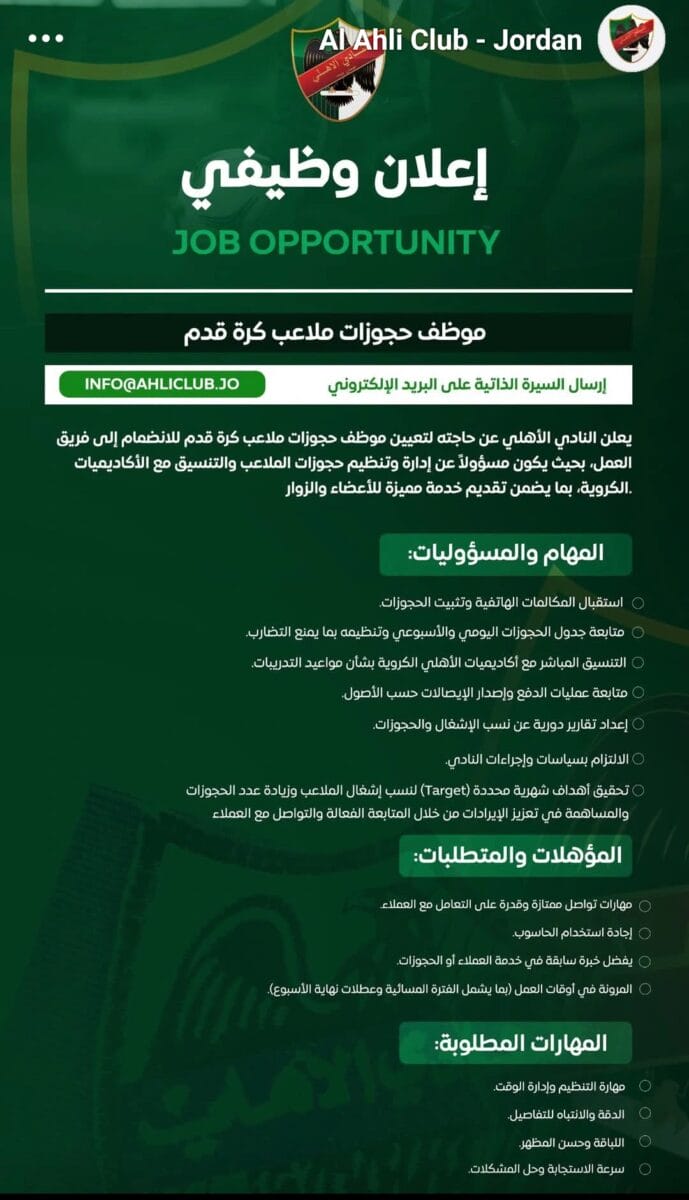 يعلن النادي الأهلي الأردني عن فرصة مميزة للانضمام إلى فريق العمل بوظيفة موظف حجوزات ملاعب كرة قدم.