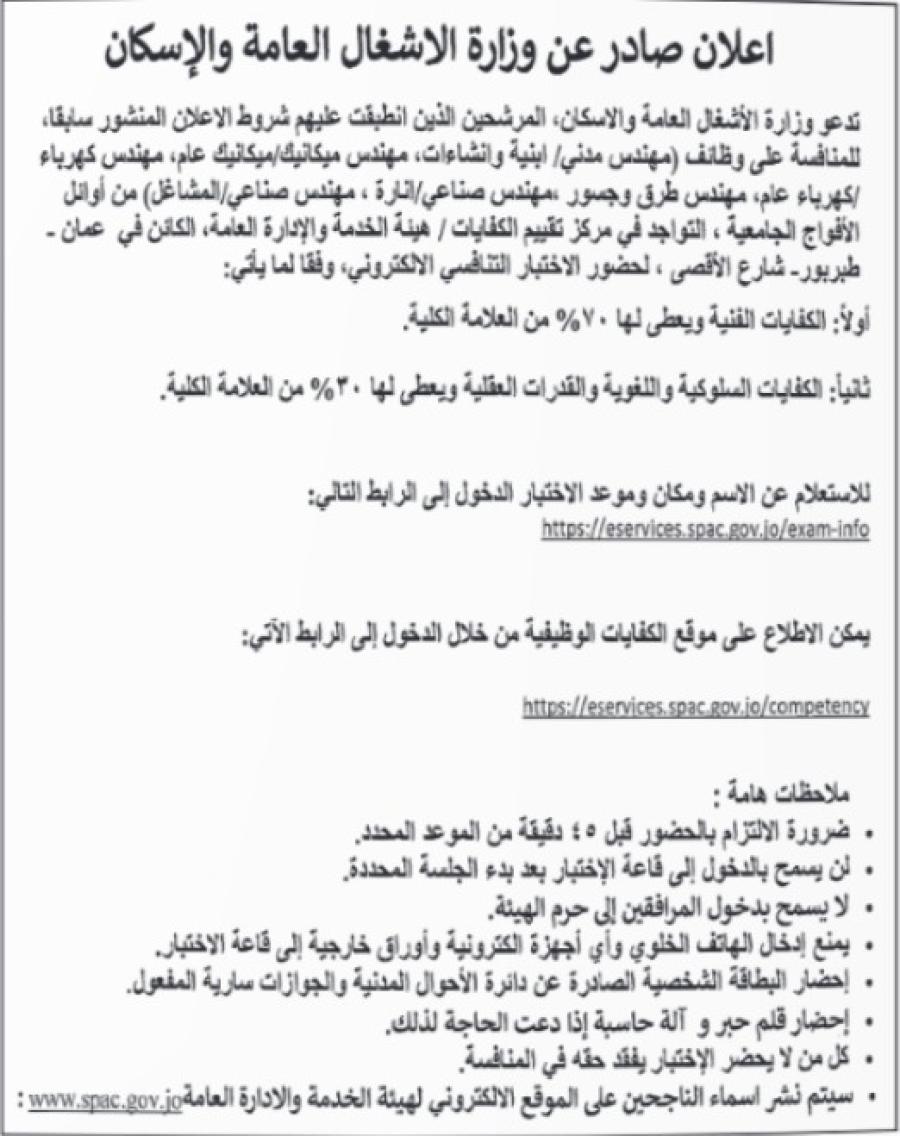 فرصتك الآن للحصول على وظيفة حكومية مستقرة ضمن أقوى الجهات الرسمية في الأردن. أعلنت وزارة الأشغال العامة والإسكان عن دعوة مرشحين لحضور الاختبار التنافسي الإلكتروني لعدة تخصصات هندسية.