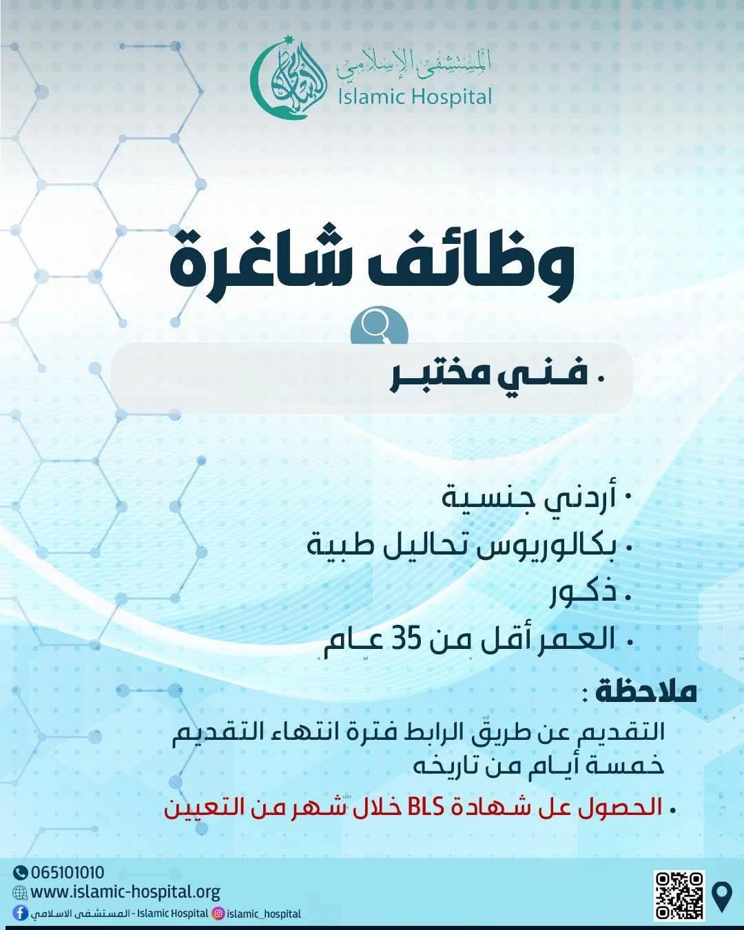 يعلن المستشفى الإسلامي عن توفر شاغر فني مختبر للعمل ضمن كوادره الطبية في عمّان.