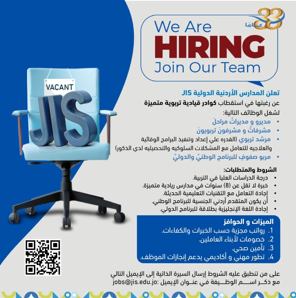 تعلن المدارس الأردنية الدولية عن رغبتها في استقطاب كوادر قيادية تربوية متميزة للانضمام إلى فريقها الأكاديمي للعام 2026.