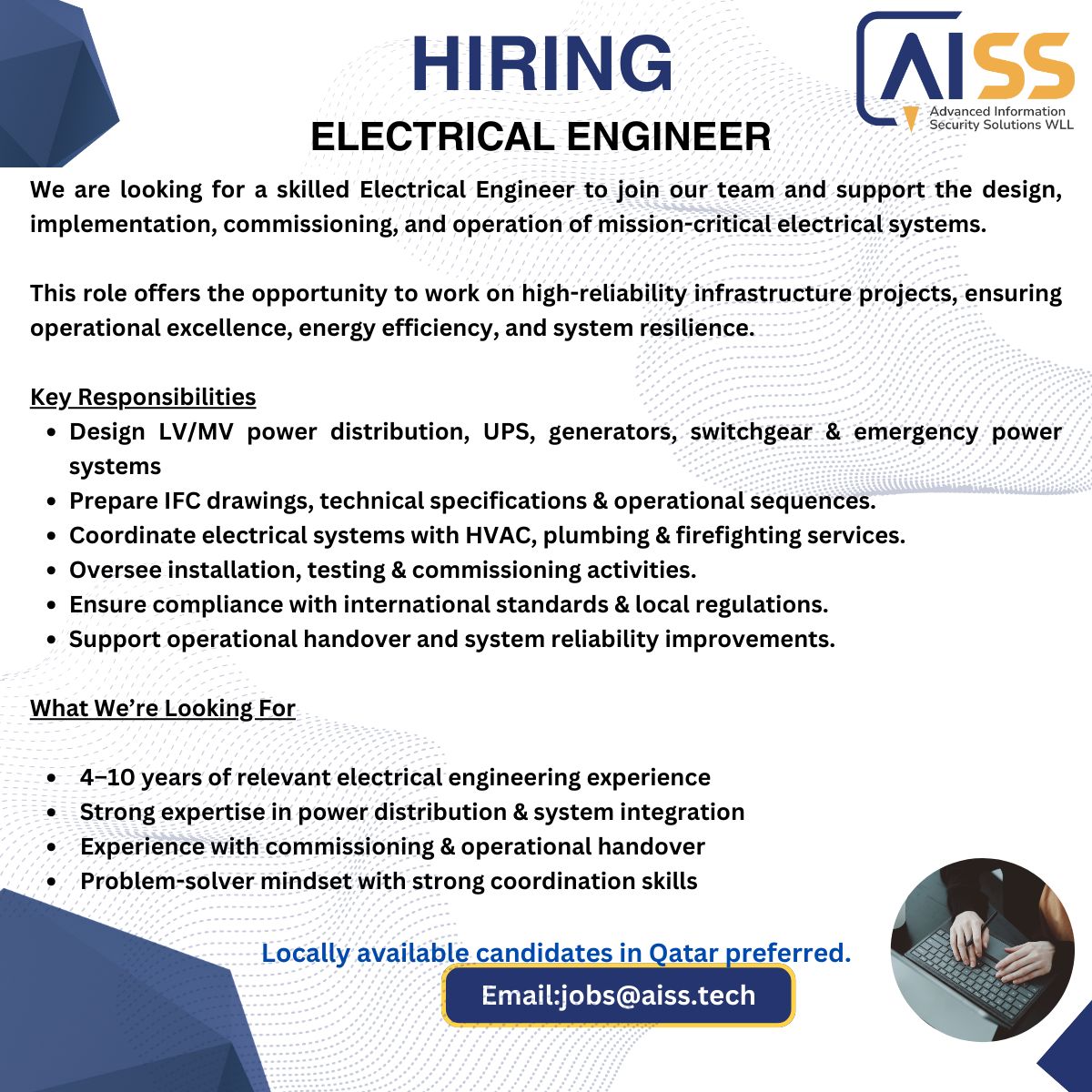 تعلن AISS – Advanced Information Security Solutions WLL عن توفر شاغر مهندس كهرباء (Electrical Engineer) ضمن فريق المشاريع الحيوية.