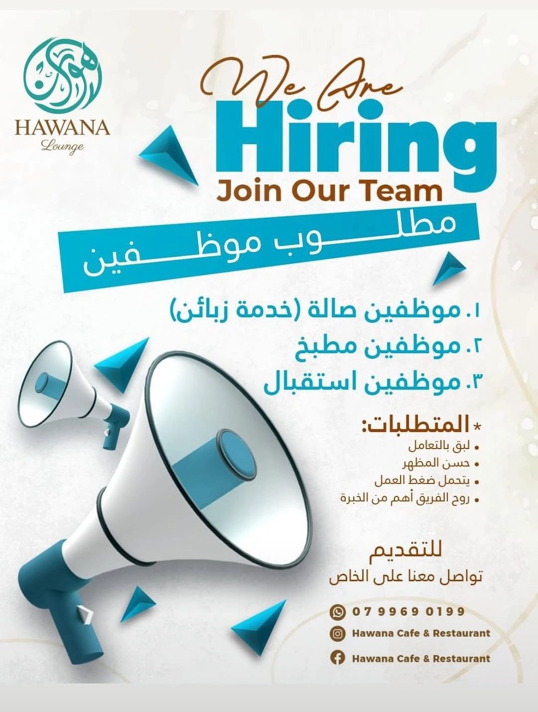 تعلن Hawana Lounge (Hawana Cafe & Restaurant) عن حاجتها لتعيين: