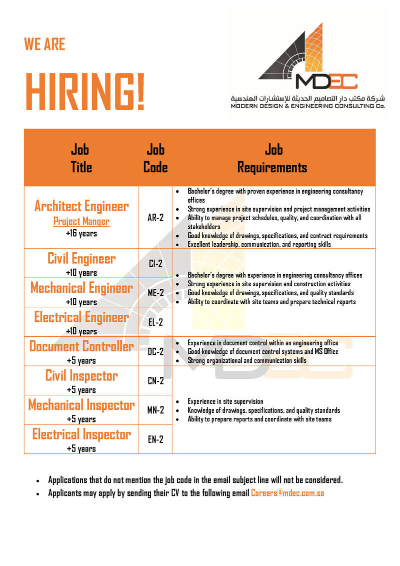 تعلن شركة Modern Design & Engineering Consulting Co. (MDEC) عن فتح باب التوظيف لعدة تخصصات هندسية وإشرافية ضمن مشاريع كبرى داخل المملكة.