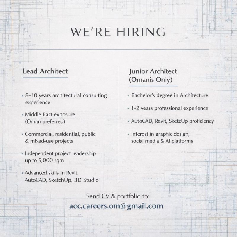 تعلن شركة AEC Careers OM عن فتح باب التوظيف لشغل وظائف معمارية مميزة في سلطنة عُمان.