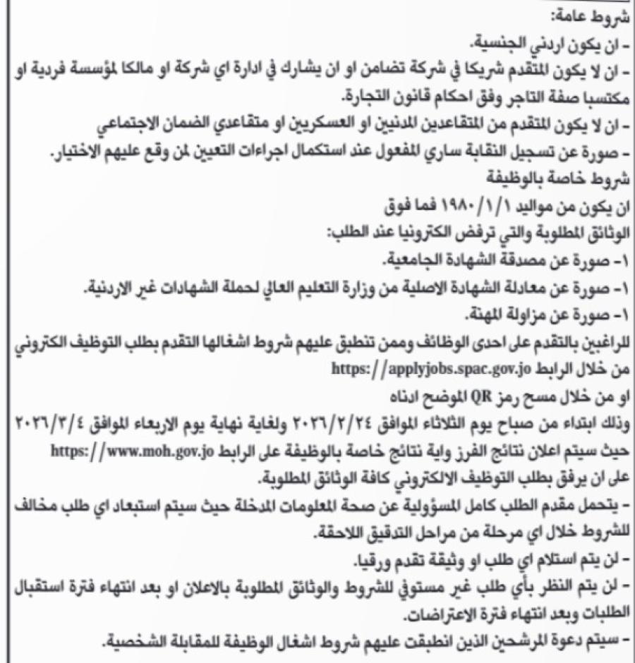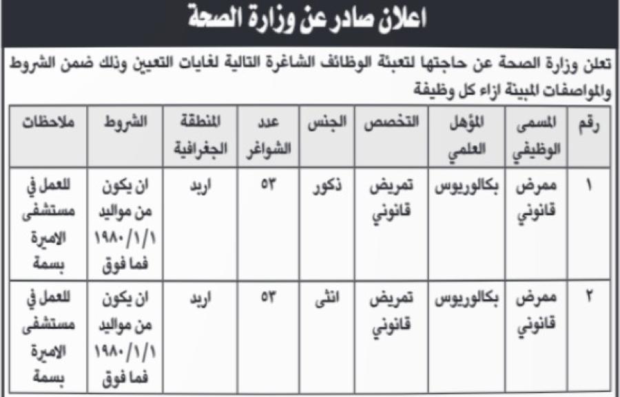 أعلنت وزارة الصحة الأردنية عن فتح باب التعيين لوظيفة ممرض قانوني (ذكور وإناث) للعمل في مستشفى الأميرة بسمة بمحافظة إربد ضمن شواغر رسمية لعام 2026.