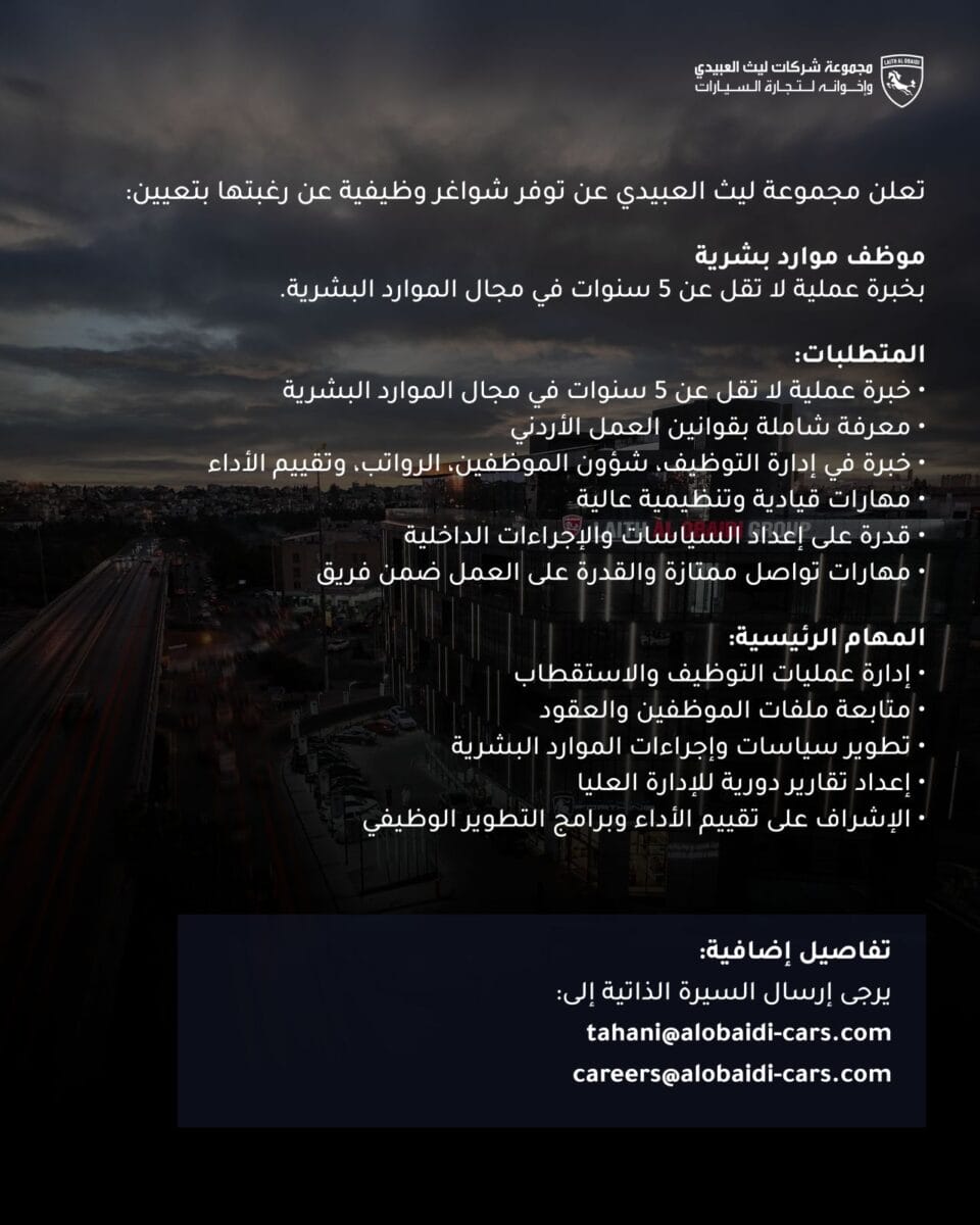 تعلن مجموعة ليث العبيدي للسيارات عن فتح باب التوظيف لشغل وظيفة موظف موارد بشرية بخبرة قوية في قوانين العمل الأردني وإدارة شؤون الموظفين، ضمن بيئة احترافية توفر استقرارًا ماليًا وفرص تطوير حقيقية.