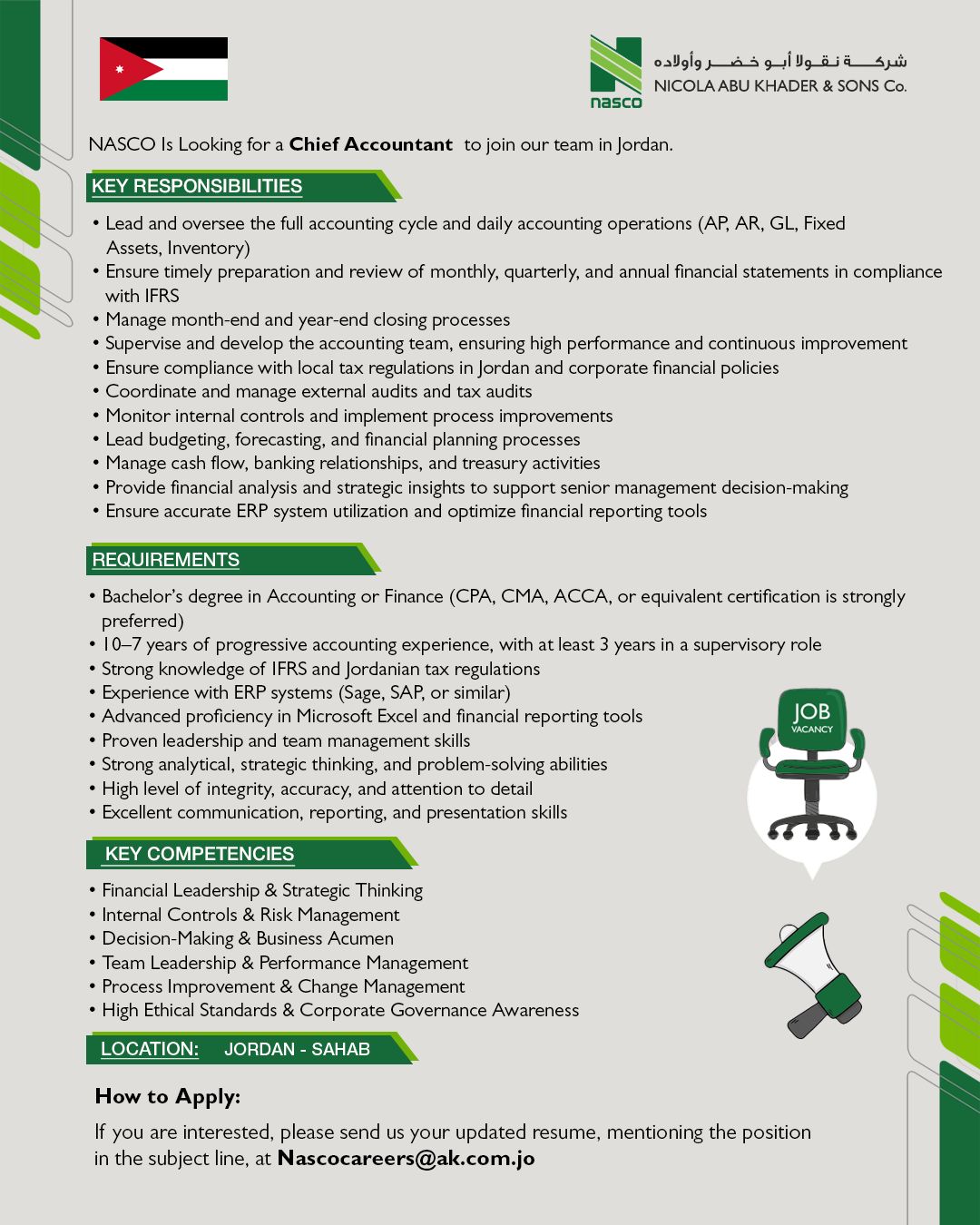 تعلن شركة ناسكو الأردن (Nasco – Nicolabu Khader & Sons Co.) عن فتح باب التوظيف لشغل وظيفة مدير حسابات (Chief Accountant) ضمن بيئة عمل احترافية توفر استقرارًا ماليًا ونموًا مهنيًا طويل الأمد.